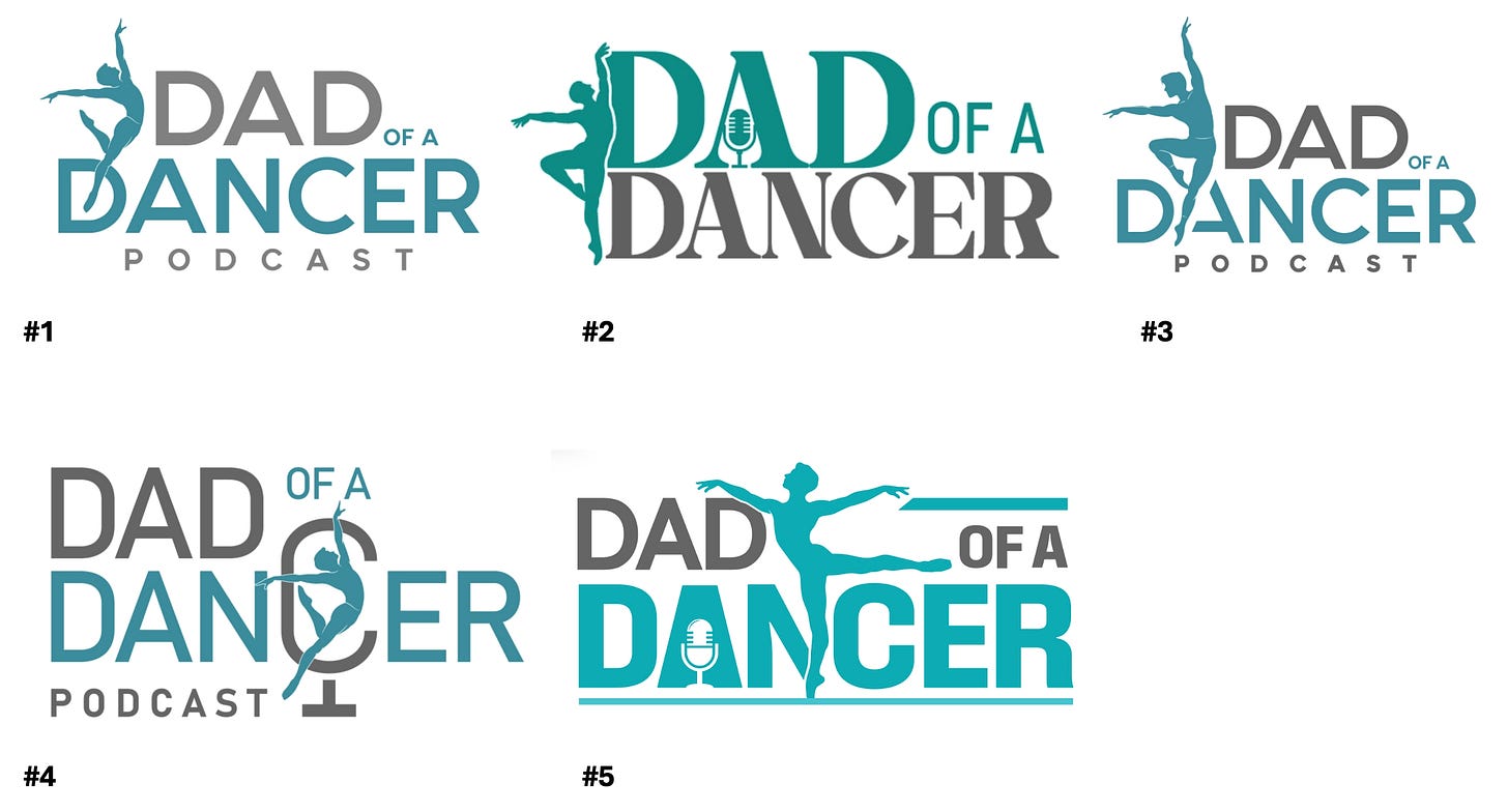 Logo contest finalists announcedToo many good ones to pick fromBrian JohnsonDec 02, 2025ShareAfter a lot of input, we’re down to these 5 logos for the Dad of a Dancer podcast. Got a favorite or favorites? Let us know in the comments!(Personally, I’m torn between #1 and #3)Thanks,BrianThanks for reading Dad of a Dancer! Subscribe for free to receive new posts and support my work.SubscribePreviousNext